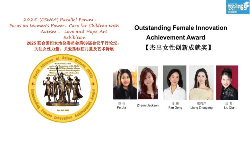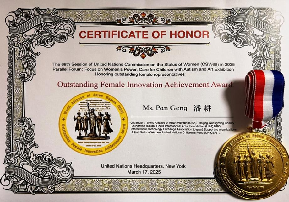 2025年联合国妇女地位委员会第69届会议(CSW69)于3月10日至3月21日在联合国总部举行。我校表演学部广播电视编导(影视编创)专业教师潘耕受世界亚裔女性联盟邀请,于纽约联合国总部外交会议厅参加会议平行论坛:聚焦女性力量,关爱孤独症儿童及“爱与希望”艺术特展,并获得“杰出女性创新成就奖”。