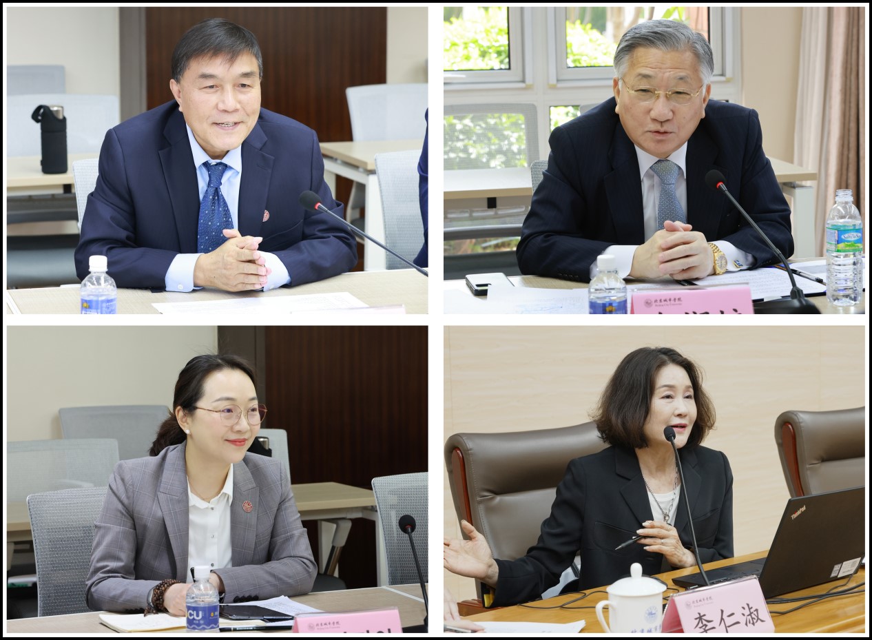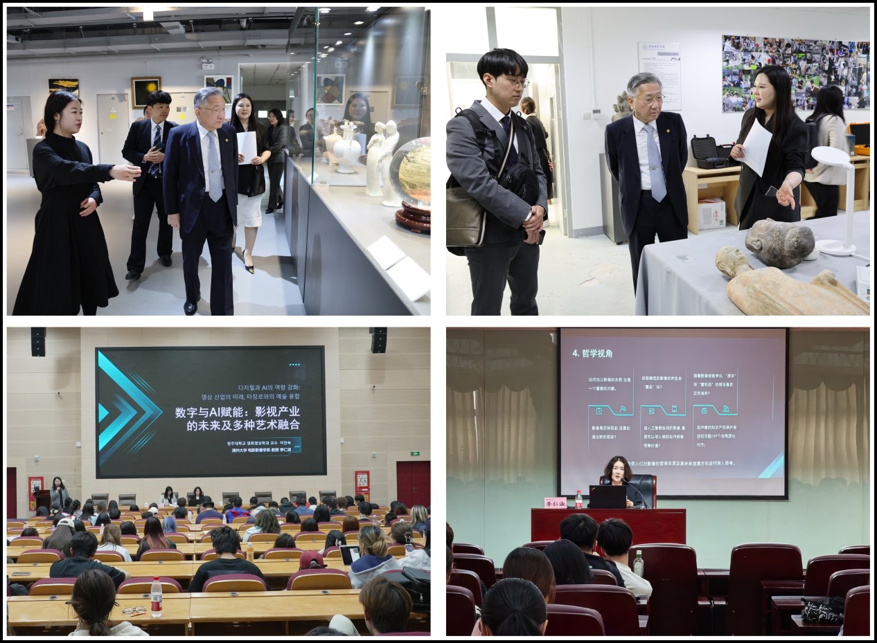 签约仪式后,清州大学校长一行参观了我校文化遗产学部“工艺美术展”和国际文化与传播学部,对我校在教育教学、社会服务、科学研究、国际合作等方面所取得的成绩给予了高度的评价。清州大学艺术学院李仁淑教授在顺义校区和航天城校区分别作了题目为“数字与AI赋能:影视产业的未来版图及艺术融合”的专业讲座,获得了专业教师及学生一致好评。