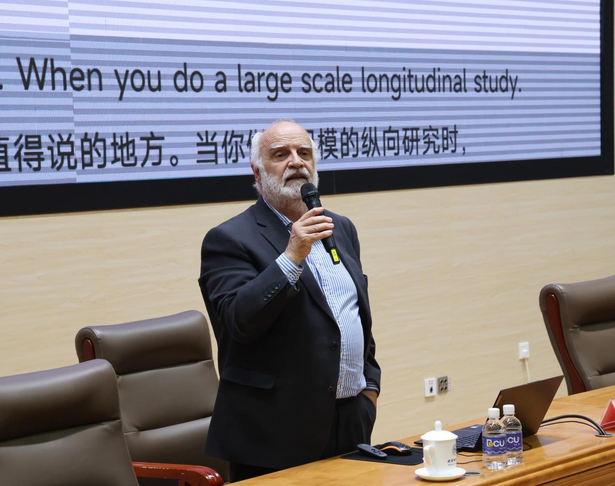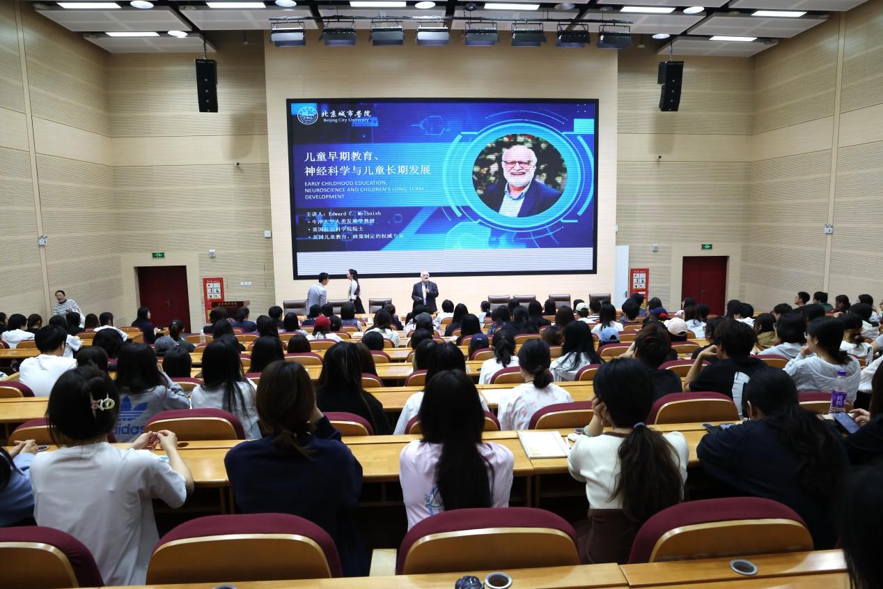 当日下午,Edward Melhuish院士在顺义校区综合楼西阶梯教室作“儿童早期教育、神经科学与儿童长期发展”主题讲座,通过多国实证研究证明:“优质早期教育可提升儿童终身发展能力,其中语言能力与自我调节能力尤为关键。”在互动环节,师生就“数字技术教育应用边界”、“弱势儿童精准干预”等议题深度交流。