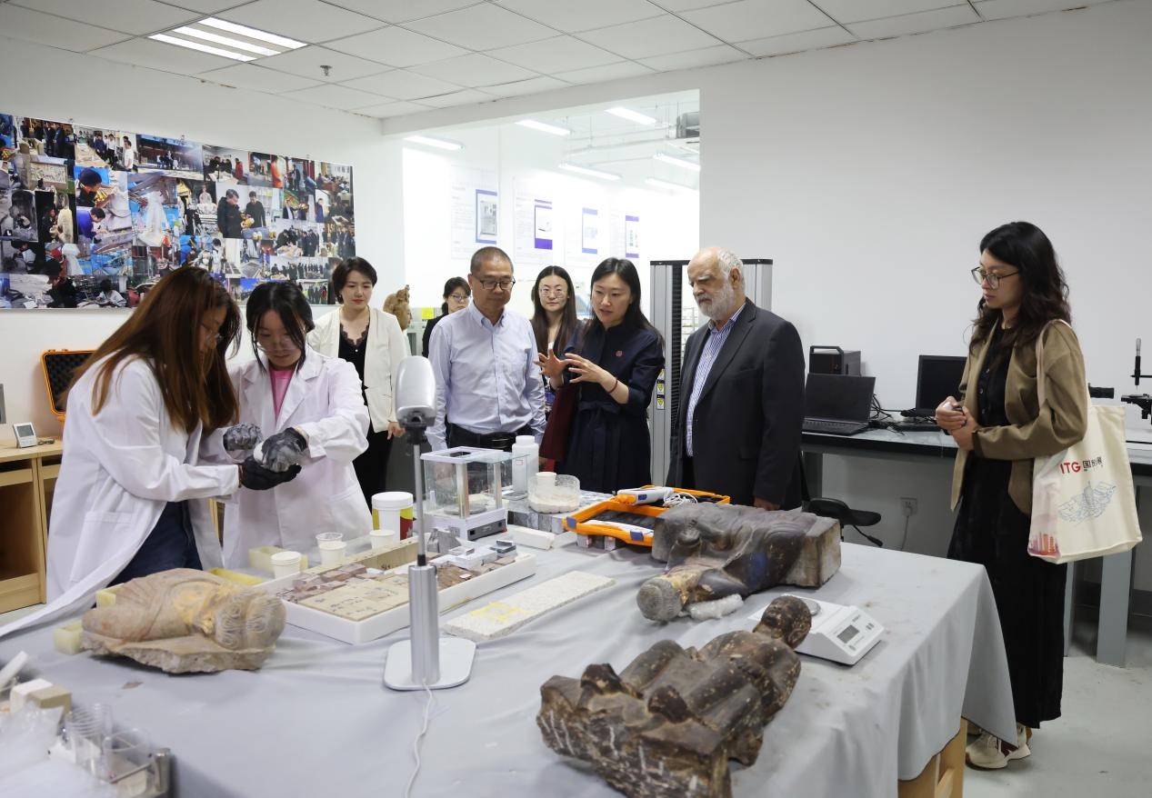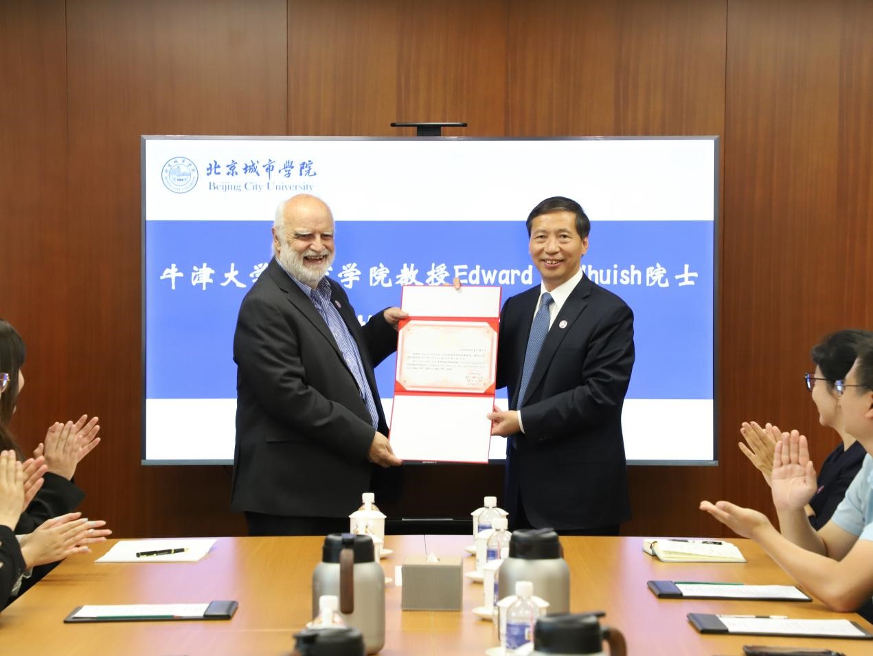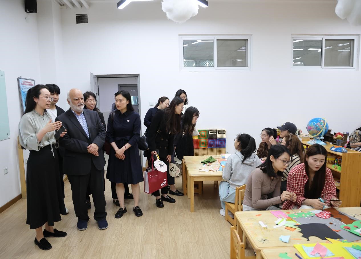 聘任仪式前,Edward Melhuish院士于5月22日参访我校顺义校区及相关学部。我校党委书记龚裕在参观前会见并向院士重点介绍了学校的基本情况。在文化遗产学部主任陈秋荣的陪同讲解下,院士重点参观了明代漆棺数字化修复、微痕技术复原碑刻等创新成果,称赞“科技与传统的融合体现了东方智慧”。在教育学部,院士与学部主任周建辉及一线教师边走访边交流,观摩了蒙台梭利几何教学、绘本阅读课程等实训课堂,特别肯定婴幼儿抚触操对神经发育的促进作用。