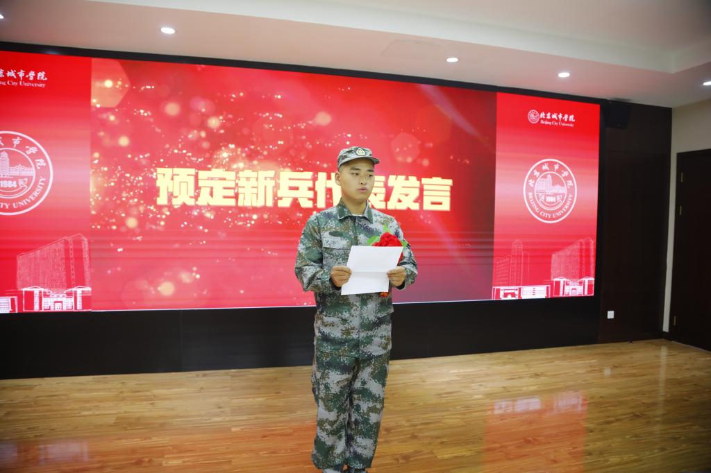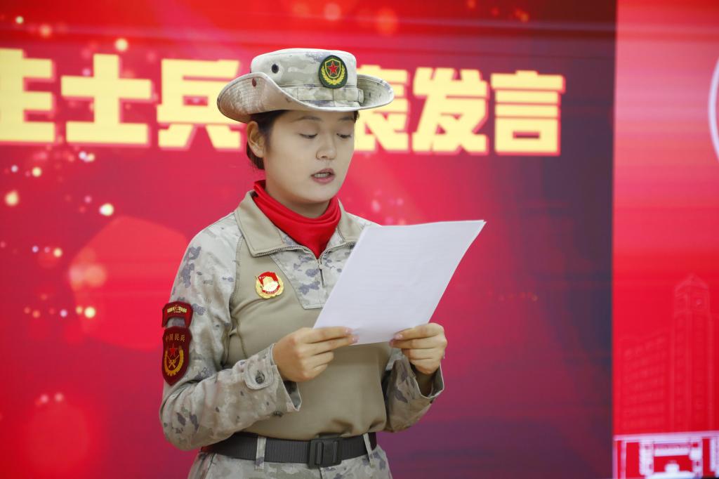 随后,信息学部学生冯泽鹏作为预定新兵代表发言。他曾服役期满,此次选择二次入伍,再度奔赴军营,展现了坚定的报国信念。信息学部学生赵玉清作为退役大学生士兵代表发言,她曾参与纪念中国人民抗日战争暨世界反法西斯战争胜利80周年阅兵女民兵方阵,生动诠释了军人本色与青春担当。
