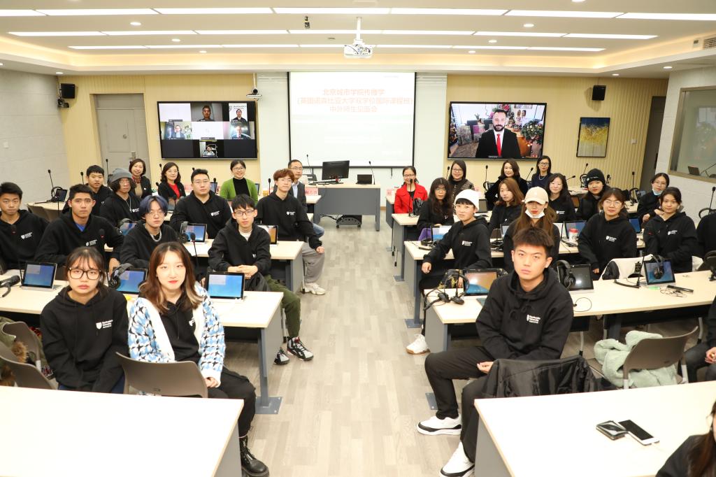 赵志强代表学校回顾了十年来我校与英国诺森比亚大学的友好合作历史。诺森比亚大学校方分别在线介绍了英国诺森比亚大学、人文艺术学院及传媒专业的详细情况。我校专业负责人魏渲介绍了传播学(英国诺森比亚双学位国际课程班)发展历史、人才培养路径及培养目标。同学们就关心的课程设置与就业升学前景问题与线上的诺森比亚大学老师做了积极互动。