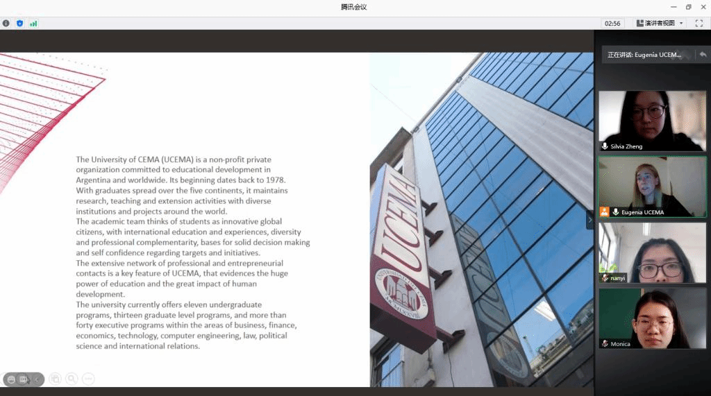 根据阿根廷使馆的安排,我校西班牙语专业与阿根廷21世纪大学(Universidad Siglo XXI)和CEMA大学(Universidad del CEMA)进行了一对一交流,双方就学校概况、合作意向和具体项目进行了交流,由于时间限制,双方最终商定将通过邮件的方式交换双方项目宣传资料并保持进一步沟通。