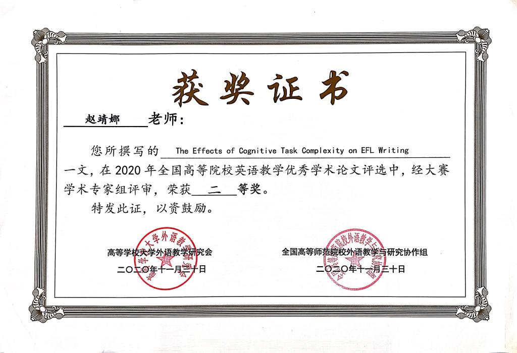 12月,英语教研室教师在两项高水平的教学及教科研评比中斩获佳绩。其中,赵靖娜老师所撰写的The Effect of Cognitive Task Complexity on EFL Writing一文在“2020年全国高等院校英语教学优秀学术论文评选”中荣获二等奖。郭晓霞老师所带领的教学团队在高等教育出版社与《中国外语》编辑部共同举办的“首届全国高等学校外语课程思政教学比赛”中获得全国决赛二等奖。