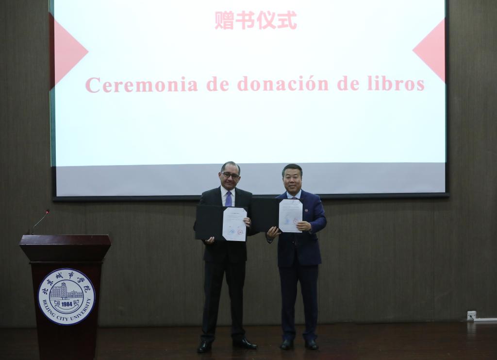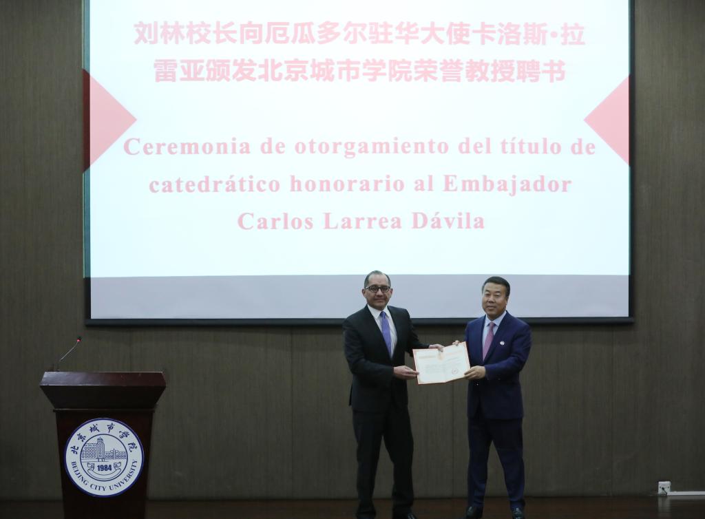 最后,卡洛斯·拉雷亚大使向刘林校长递交了捐赠文书,完成了捐赠。刘林校长代表学校向卡洛斯·拉雷亚大使授予荣誉教授的聘书, 希望他未来创造更多的机会为我校师生介绍厄瓜多尔文学与历史等。