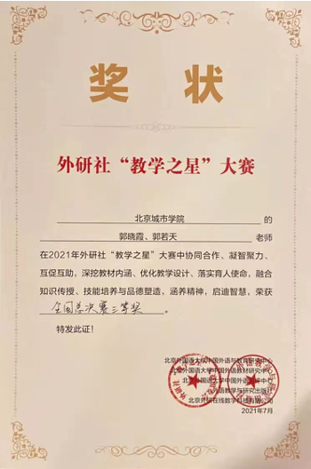 2021年7月31日-8月1日,探花直播国际文化与传播学部英语教研室教师郭晓霞、郭若天参加了2021年外研社“教学之星”大赛全国半决赛,最终喜获英语专业类组全国半决赛二等奖和全国总决赛三等奖。