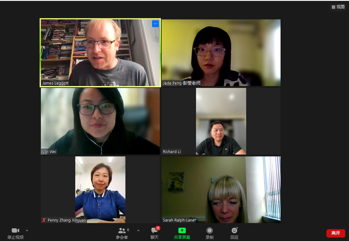 英国诺森比亚大学传媒系主任James Leggott、大众传播项目负责人Sarah Ralph-Lane、国际文化与传播学部副主任张心远、传播系副主任魏渲和传播学(英国诺森比亚大学双学位国际课程班)骨干教师彭莹参与了本此会议。两校教师商讨了2021级中外师生见面会、本科联合授课的内容安排,并就联合举办“城市文化传播”主题学术交流进行了前期讨论。