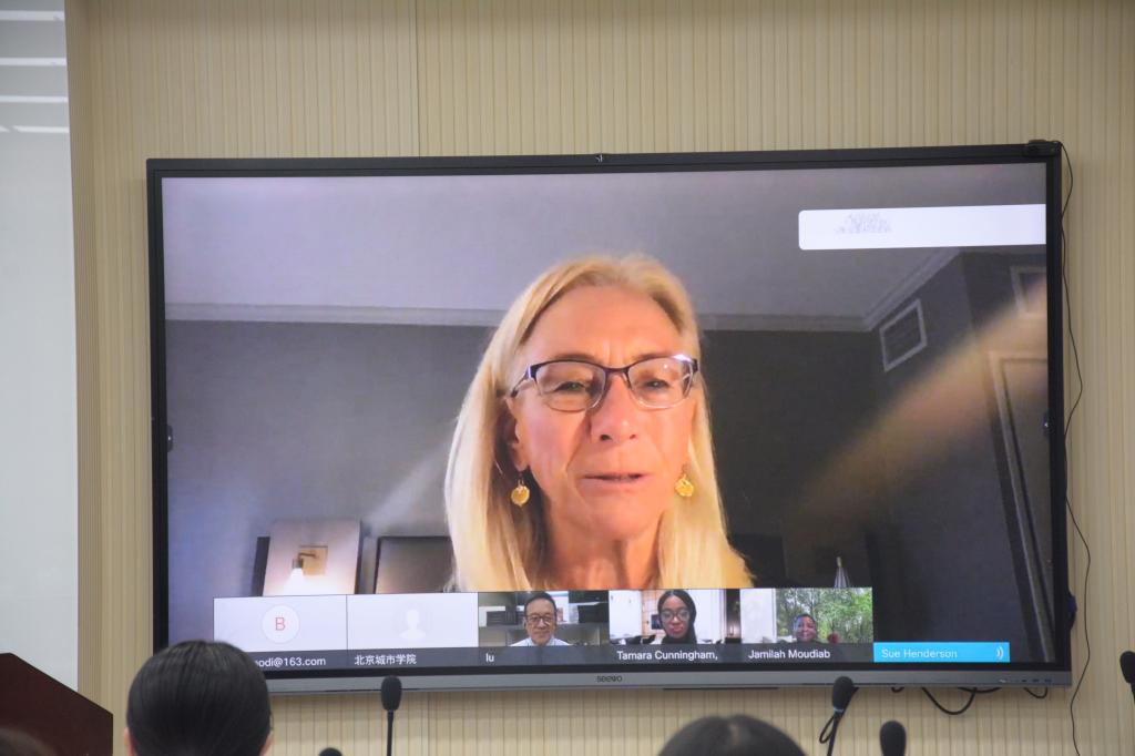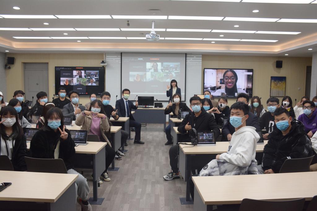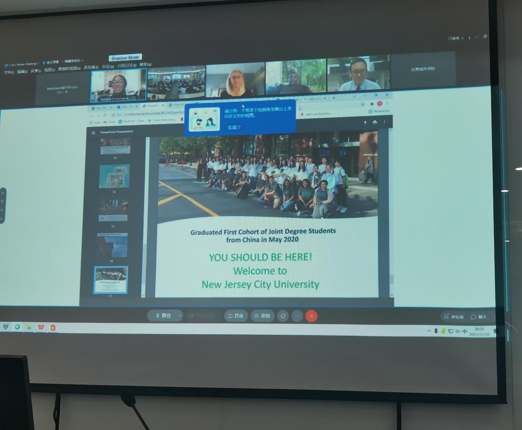 11月10日晚,我校与美国新泽西城市大学共同举办中外师生见面会,活动在国际文化与传播学部同传实验室采取线上线下联合的方式顺利举行。美国新泽西城市大学校长Sue Henderson、校长助理Tamara Cunningham等美方教师线上出席,我校副校长练玉春、国际文化与传播学部副主任张心远以及金融学(美国新泽西城市大学双学位国际课程班)专业师生共同参加了本次活动。