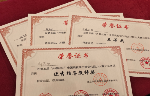 11月6日,国际文化与传播学部2019级英语专业吕海正阳、2020级德语专业沈杰夫、2021级传播学(国际视听实验班)毕海天三位同学组成的参赛团队在第五届“外教社杯”全国高校学生跨文化能力大赛探花直播赛区比赛中荣获三等奖。文传学部英语教研室刘已初老师荣获优秀指导教师奖。