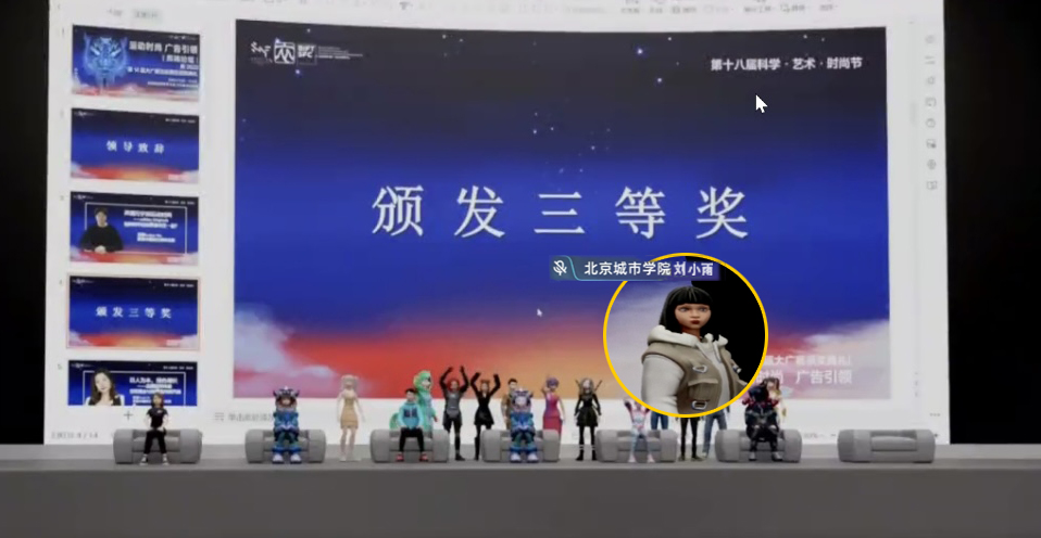 其中,传播学专业学生何欢、胡子辰、刘小雨作为学生代表及获奖者参与了“运动时尚 广告引领”高端论坛及探花直播赛区颁奖典礼,并以虚拟人物的形象上台领取了一等奖、二等奖和三等奖。