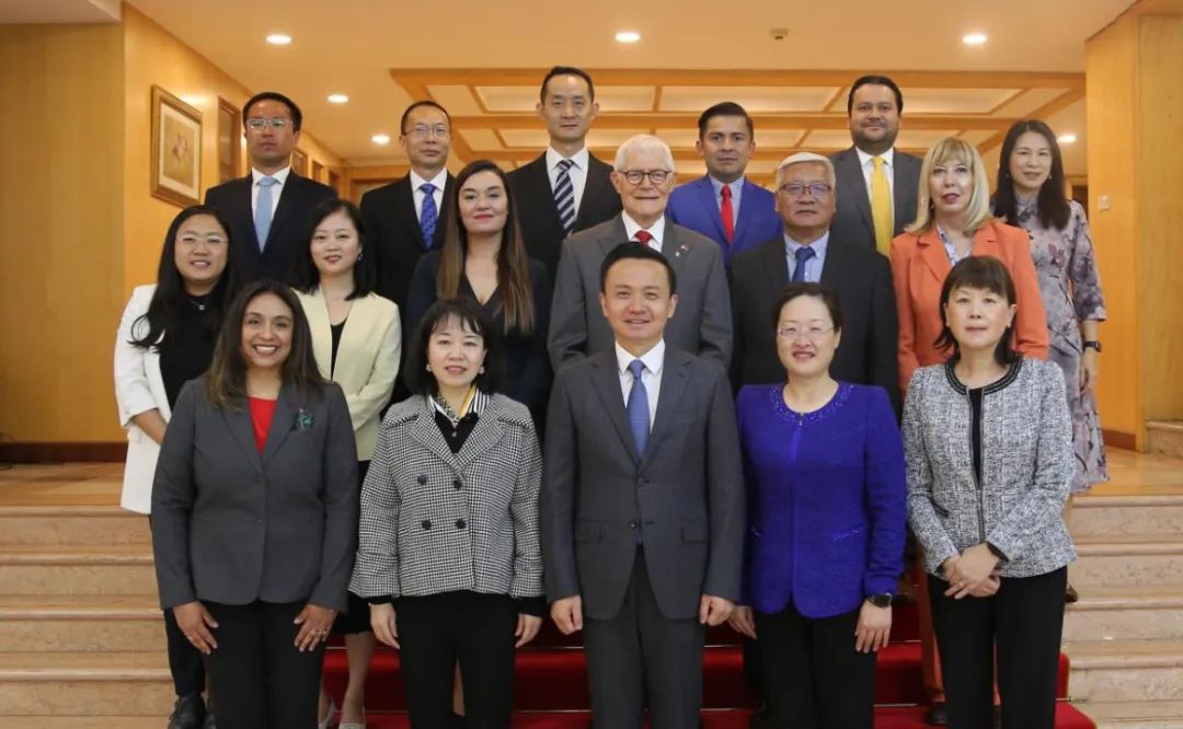 我校瓜达拉哈拉孔子学院中方院长魏淑华(中排左起第二位)、外方院长爱德文·贝约(上排右起第三位)接受驻墨西哥大使张润集体会见