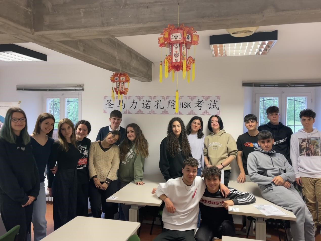 考试分为线上、线下两种途径,其中圣马力诺高中以及意大利里米尼市语言高中的学生在孔院参加了线下考试,意大利科森扎市卢克雷齐娅·德拉瓦莱(IIS Lucrezia della Valle)学校的24名学生参加了线上考试。院长及志愿者老师们为确保考试顺利进行开展了多次考前考务会,指导学生进行信息填报以及模拟测试。