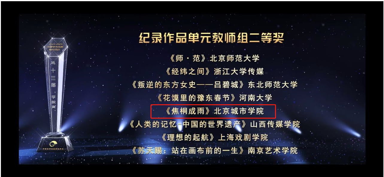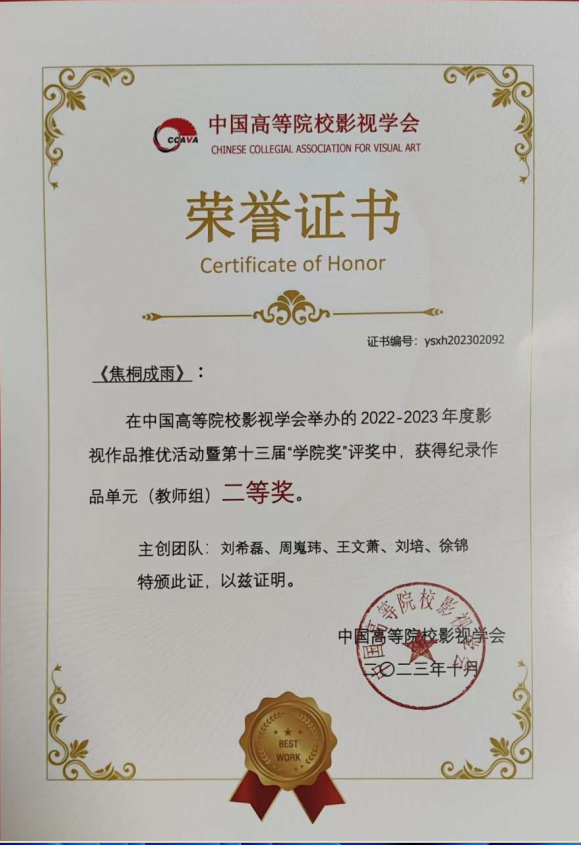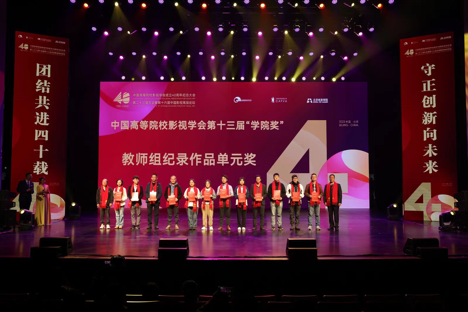 10月21日,中国高校影视学会第二十三届年会2022-2023年度影视作品推优活动暨第十三届“学院奖”颁奖典礼在探花直播电影学院怀柔校区千人剧场举行。来自探花直播大学、清华大学、复旦大学、上海交通大学、探花直播师范大学、中国传媒大学、探花直播电影学院、澳门大学、澳门科技大学等高校近800名专家、学者参加。我校文传学部刘希磊、周嵬玮、王文萧、刘培、徐锦等担任主创的作品《焦桐成雨》喜获第十三届“学院奖”纪录片单元(教师组)二等奖。