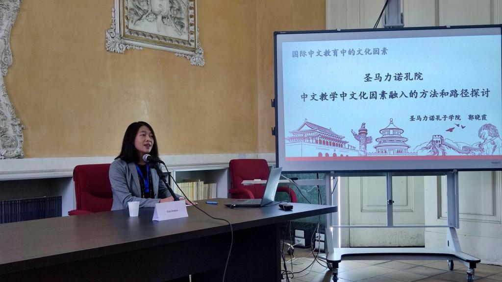 圣马力诺孔子学院中方院长郭晓霞出席会议并就“圣马力诺孔院中文教学中文化因素融入的方法和路径探讨”作主题交流。郭晓霞在对世界中文教学中文化元素融入现状进行总结的基础上,从教材、教师素养、教法三个层面对现存问题进行了分析,并向各孔院就进一步研讨和协作提出倡议。主题发言得到了意大利各孔院院长的认可和积极回应,并在对志愿者进行岗中培训、提高教师素养等方面达成初步意向。