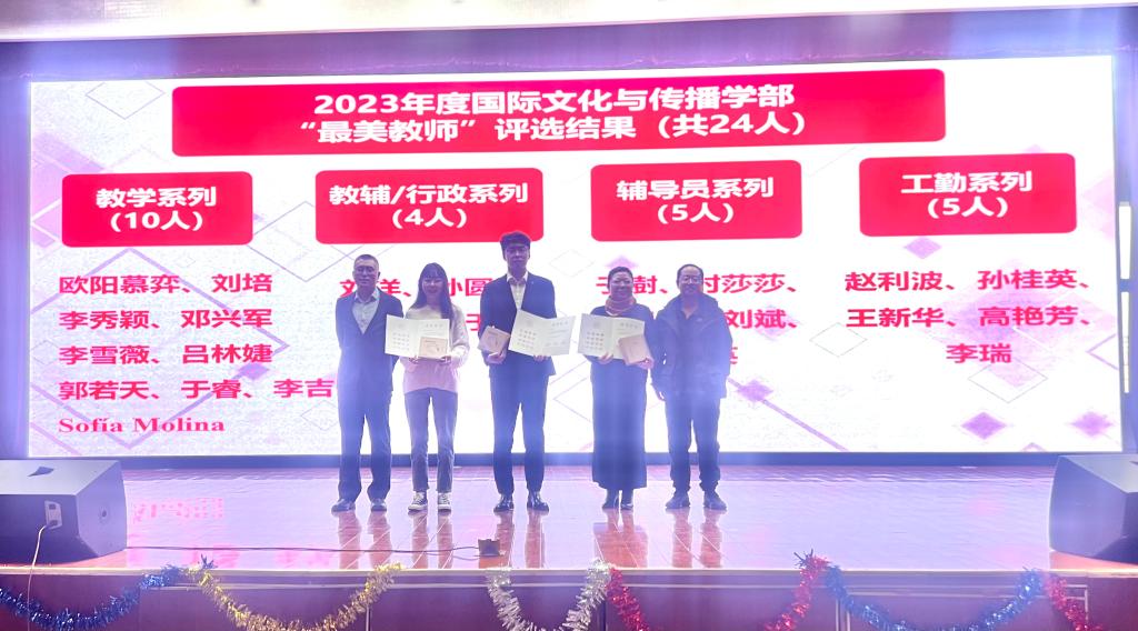 通过班级推荐,学生代表打分,最终选出教学系列“最美教师”10人:欧阳慕弈、刘培、李秀颖、邓兴军、李雪薇、吕林婕、郭若天、于睿、李吉、Sofía Molina;通过教师投票选出教辅行政/系列“最美教师”4人:刘洋、孙圆媛、刘晶、于翀;评选出辅导员系列“最美教师”5人:于澍、时莎莎、孙凯晨、刘斌、姜英,工勤系列“最美教师”5人:赵利波、孙桂英、王新华、高艳芳、李瑞。