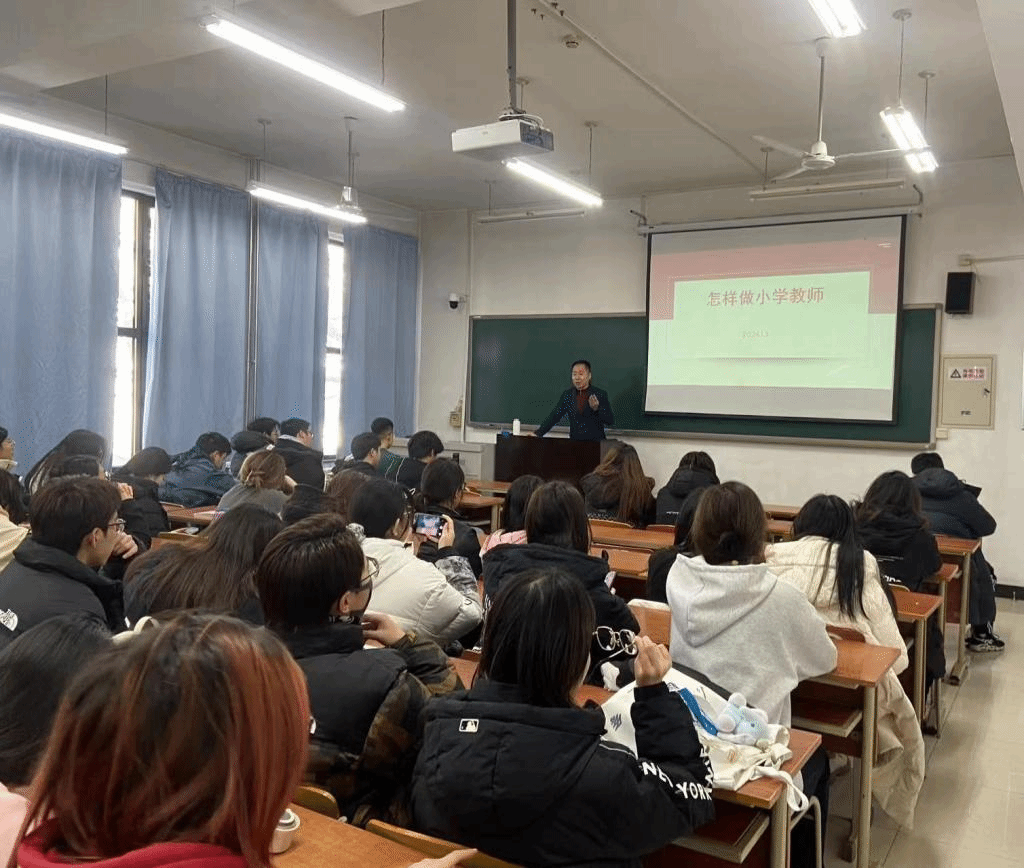 李拥军以自己在学习和工作中的现实经历为例,引导同学们思考要怎样做小学教师,怎么才能做好小学教师。他运用小学发生的实际案例和自己的亲身经历告诫大家,必须要学会如何与小学生进行交流,要成为被学生喜爱的教师;并用小学语文教材中的知识侧面引入,告诉大家要坚持贯彻党和国家的教育方针,争做“四有好老师”,做好学生的“引路人”。