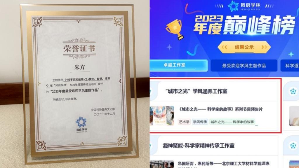 近日,中国科学技术协会“风启学林”社区官方网站公布2023年度巅峰榜,我校《城市之光——科学家的故事》系列节目多项成果榜上有名,我校“城市之光”学风涵养工作室被评选为2023年度卓越工作室。专访我校李升科教授的节目《情怀、智慧、境界》获评2023年度最受欢迎学风主题作品。《城市之光——科学家的故事》系列节目入选中国科协2023年学风传承行动科学家故事研习项目优秀案例。我校系列作品受到中国科协领导及评审专家高度认可。