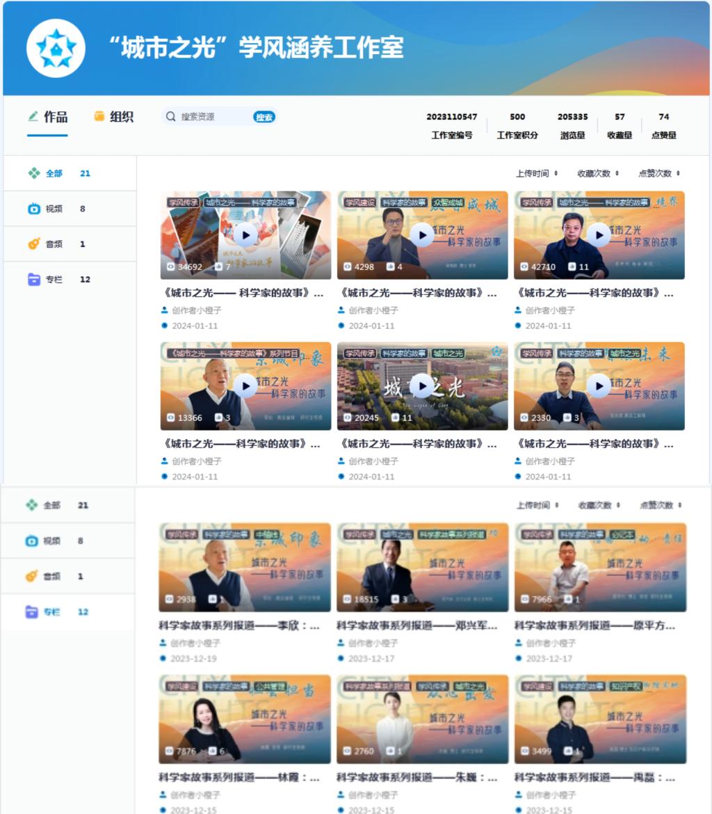 《城市之光——科学家的故事》系列节目由中国科协专项委托我校文传学部朱方副教授团队制作并出品,团队包括20余位校内外教师和文传学部120余位在校学生。耗时半年时间,先后完成了12篇人物专访报道、6个访谈视频作品,并创作了主题曲《城市之光》音频及MV,成功塑造了我校研究城市科学、解决城市问题的学者形象,弘扬了科学探索精神。系列节目发布于中国科协“风启学林”社区被广泛浏览与转发,作品总浏览量超过20万人次。