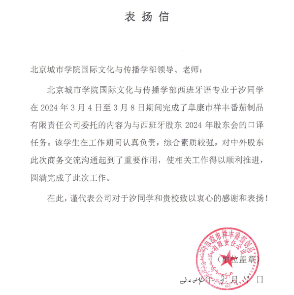 3月4日至8日,国际文化与传播学部翻译工作室派出2020级西班牙语专业于汐同学参加新疆阜康市祥丰番茄制品有限公司口译项目实践,获得中外方一致好评,并于近日发来表扬信。