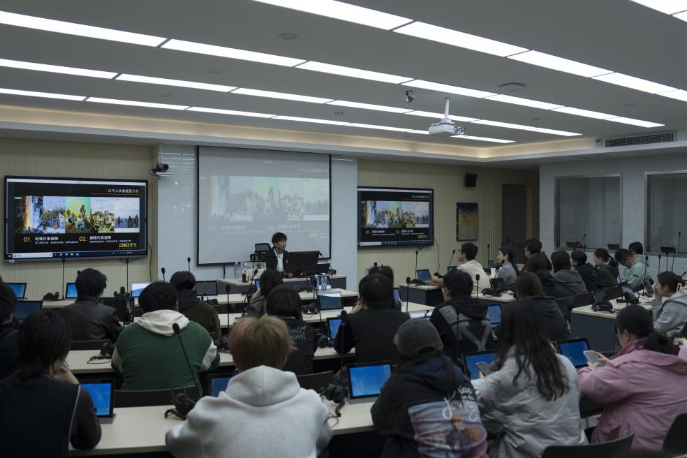 仪式结束后,谛听公司为学部师生带来一场题为“影视录音技术分享”的讲座,邀请曾参与过《隐秘的角落》、《漫长的季节》等多部优秀影视剧的录音师张楠,针对同期录音理念、同期录音设备组成与原理等进行了生动讲授与经验分享,同时以实践案例为基础,详细讲解了影视现场录音的设备管理与操作流程。