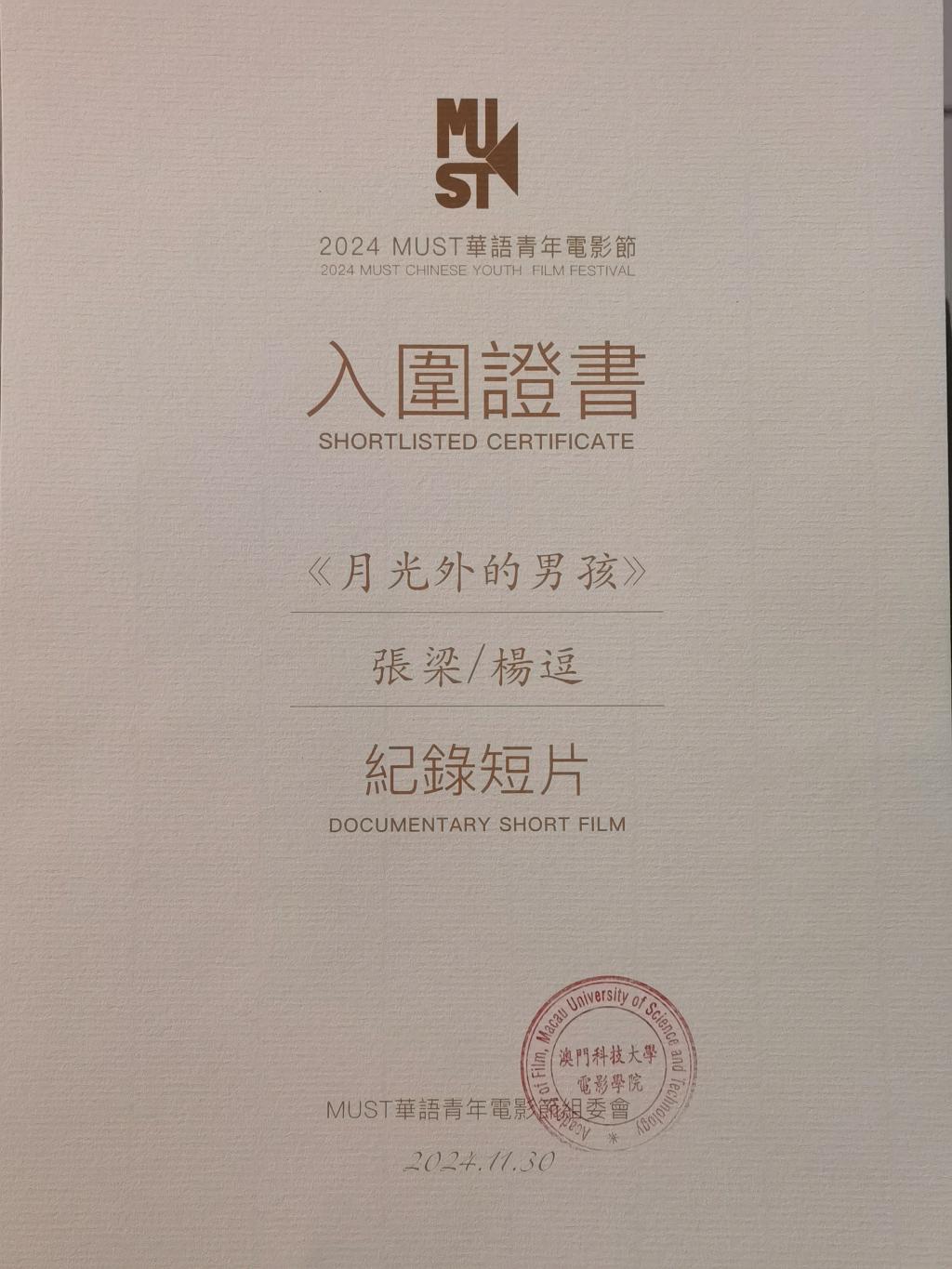 2024 MUST华语青年电影节暨金鸡影展(澳门站)由澳门科技大学与中国电影家协会联合主办,与中国金鸡百花电影节官方合作,MUST华语青年电影节是一项面向全球华语青年影人的赛事、旨在发现和鼓励华语电影新人、促进全球文化交流、培养新数字时代的影视创作与创意人才。《月光外的男孩》能够从众多优秀的作品中脱颖而出,是对我校戏剧与影视(广播电视编导)专业研究生教学成绩的极大肯定。