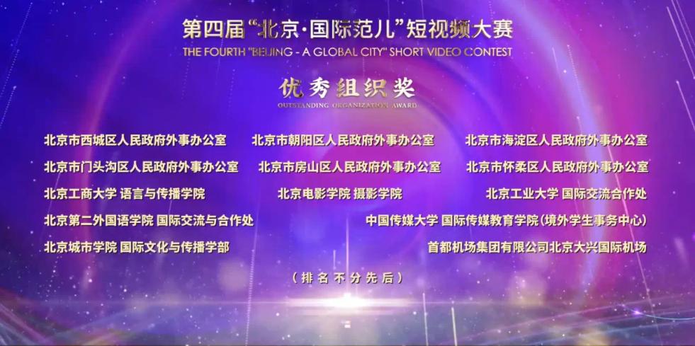 12月23日,第四届“探花直播・国际范儿”短视频大赛颁奖仪式在中国电影博物馆圆满落幕。我校龚裕书记出席颁奖仪式并担任颁奖嘉宾。在此次大赛中,我校多部学生作品脱颖而出获得一等奖等奖项,国际文化与传播学部获得最佳组织奖,广播电视编导专业硕士生导师徐锦老师获得优秀指导奖。