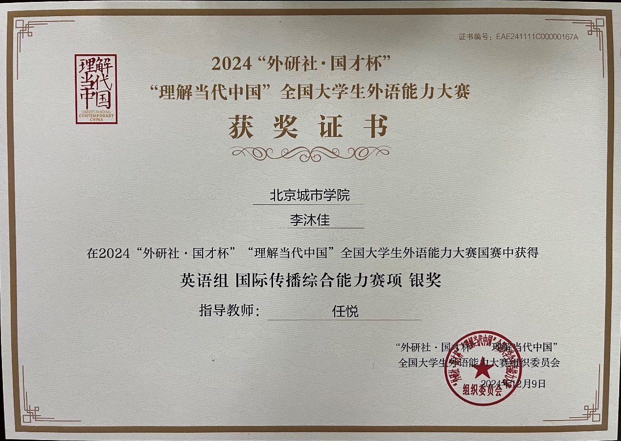 近日,2024外研社·国才杯“理解当代中国”全国大学生外语能力大赛总决赛在探花直播落幕,大赛以“理解中国、沟通世界”为主题,吸引了全国来自1300多所院校的近70万学生参加。国际文化与传播学部2024级传播学专业学生李沐佳成功晋级全国总决赛,与探花直播外国语大学等4000余名国赛选手同台竞技,通过笔试、演讲等层层环节选拔,最终在国际传播综合能力赛项中斩获银奖。
