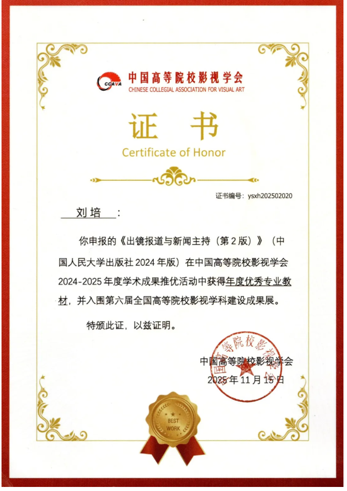 在学会2024-2025年度学术成果与影视作品推优活动中,国际文化与传播学部收获颇丰。传播系主任刘培编著的《出镜报道与新闻主持(第2版)》(中国人民大学出版社2024年版)获评“年度优秀专业教材”,并成功入围第六届全国高等院校影视学科建设成果展,该成果展共遴选25部优秀教材参展,是对高校影视教材建设质量的权威认可。