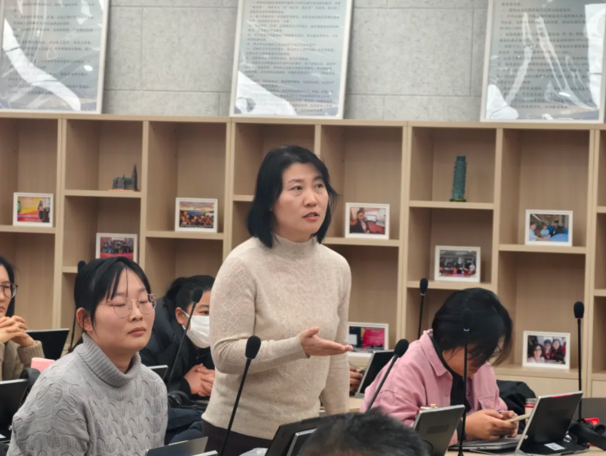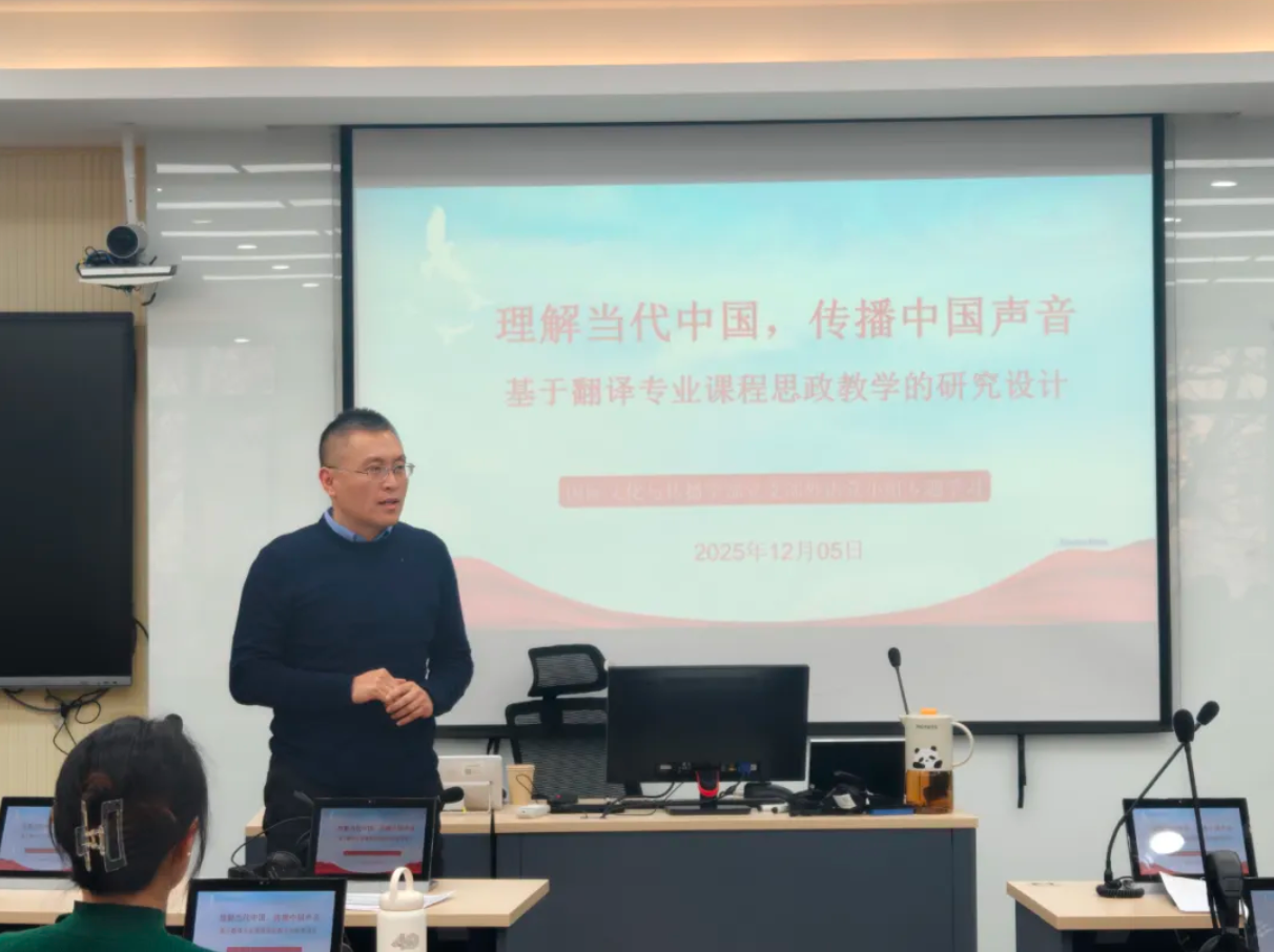 讲座中,张威重点分享了教学与科研深度融合的实践路径。他提出,外语教师可依托《理解当代中国》等教材,从三个维度推进教学改革:一是强化主题思想教育与专业技能的融合,在课程中融入中国特色社会主义核心理念,实现“课程思政”与专业教学的有机统一;二是注重中外语言文化对比与逻辑思维培养,针对汉语与外语在句法上的差异,引导学生掌握政治话语翻译的语义解释、句式重构等核心策略;三是推动教学实践向科研转化,鼓励教师将课堂中的翻译难点、学生常见错误等作为研究课题,通过收集数据、建立语料库等方式,形成“教学中研究、研究中教学”的良性循环。