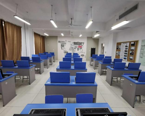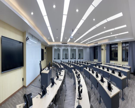 国际语言文化实践教学中心成立于2016年,包含同声传译实验室、计算机辅助翻译实验室、翻译工作室、外语教学实验室等4大专业实验室。实验室配备了Trados、传神实训系统、字幕通翻译软件、NEW CLASS同声传译软件、虚拟录播系统等10余款教学软件,开设了以《翻译工作坊》《计算机辅助翻译》《翻译项目管理》《口译实训》《交替传译》《微格教学》等为代表的系列特色实践课程,用以满足外语类专业听说读写译等多方面教学需求。