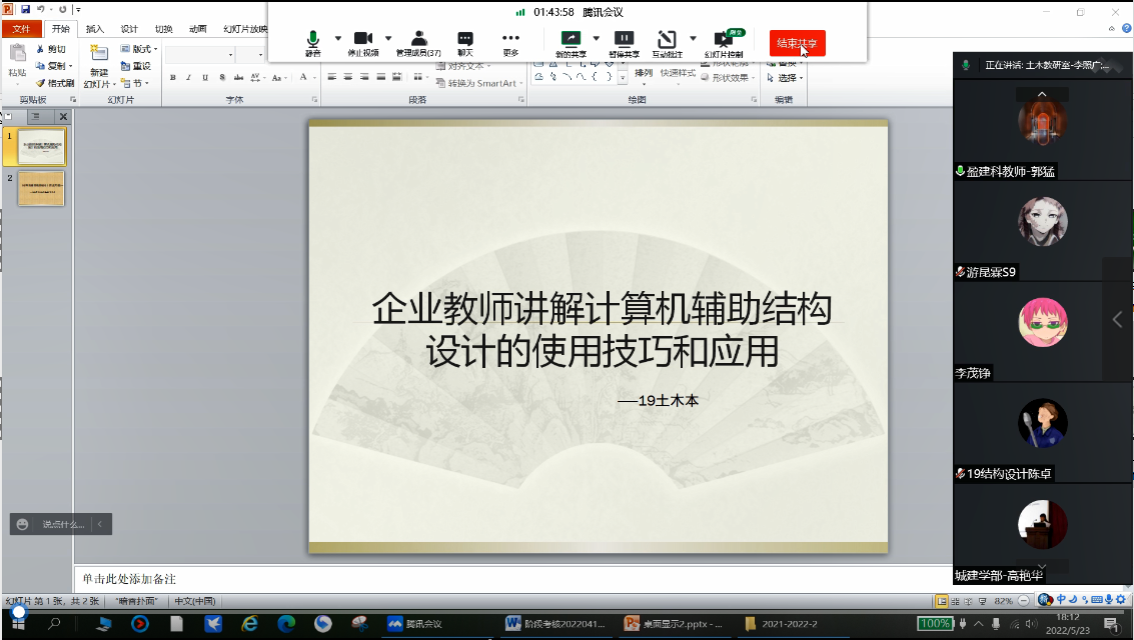 5月23日,城市建设学部邀请探花直播盈建科软件股份有限公司的工程师郭雪川、郭猛为19土木工程同学做了一场关于计算机辅助结构设计软件的使用技巧和应用情况的讲座。