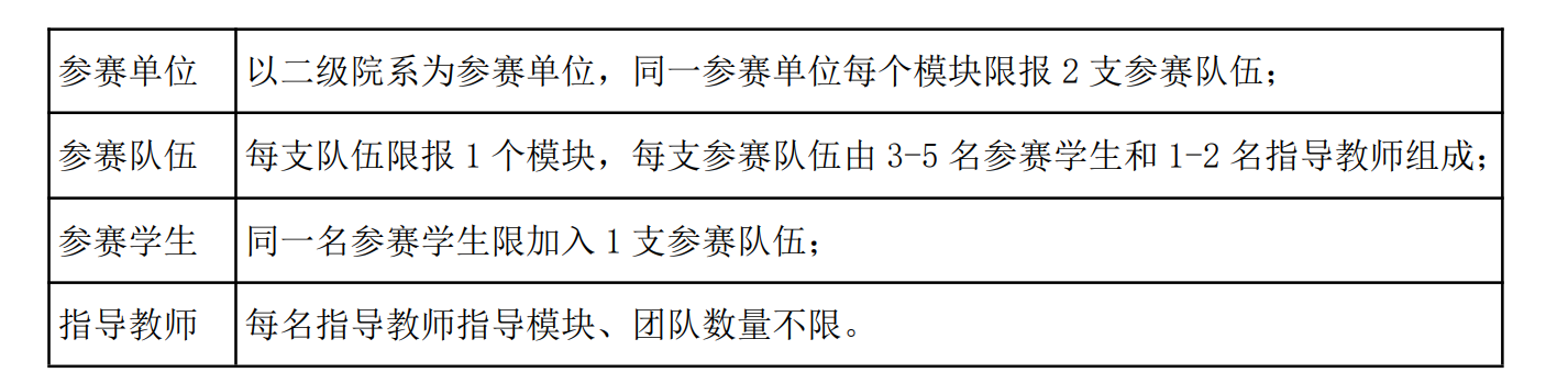 由于每个学校每个模块限报2支参赛队伍,所以学部将根据报名情况进行选拔,每个模块选出2支队伍参与全国比赛。凡报名参加比赛的队伍都能获得证书奖励并计入2课堂分。