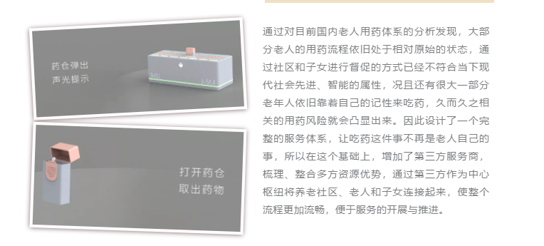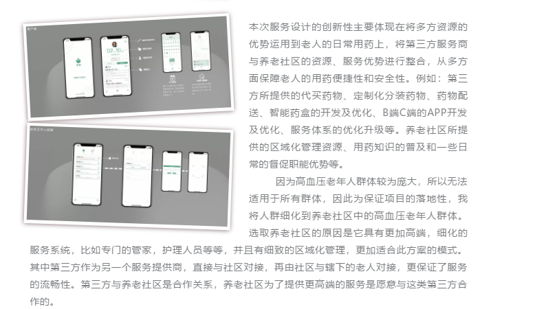 该服务设计作品通过观察到的高血压老年人于居家环境中存在的各类用药问题作为解决的主要目标,整合了养老社区与第三方的服务优势和资源优势,将老人、养老社区、第三方作为主体进行联结,相比于以往老人自己把控吃药环节而言,加强了外部把控。而智能药盒作为直接面对老人的用药智能产品,也采用定制化的配药体系,合理解决了老人在用药过程中存在的诸多不便。配套的APP系统也将保障三方体系内信息的互通,并提高第三方与养老社区的服务质量与效率。让老年患者们安全、合理、放心地吃药,不再因为吃药问题而苦恼,也让他们感受到社会对于他们是关心的、包容的。