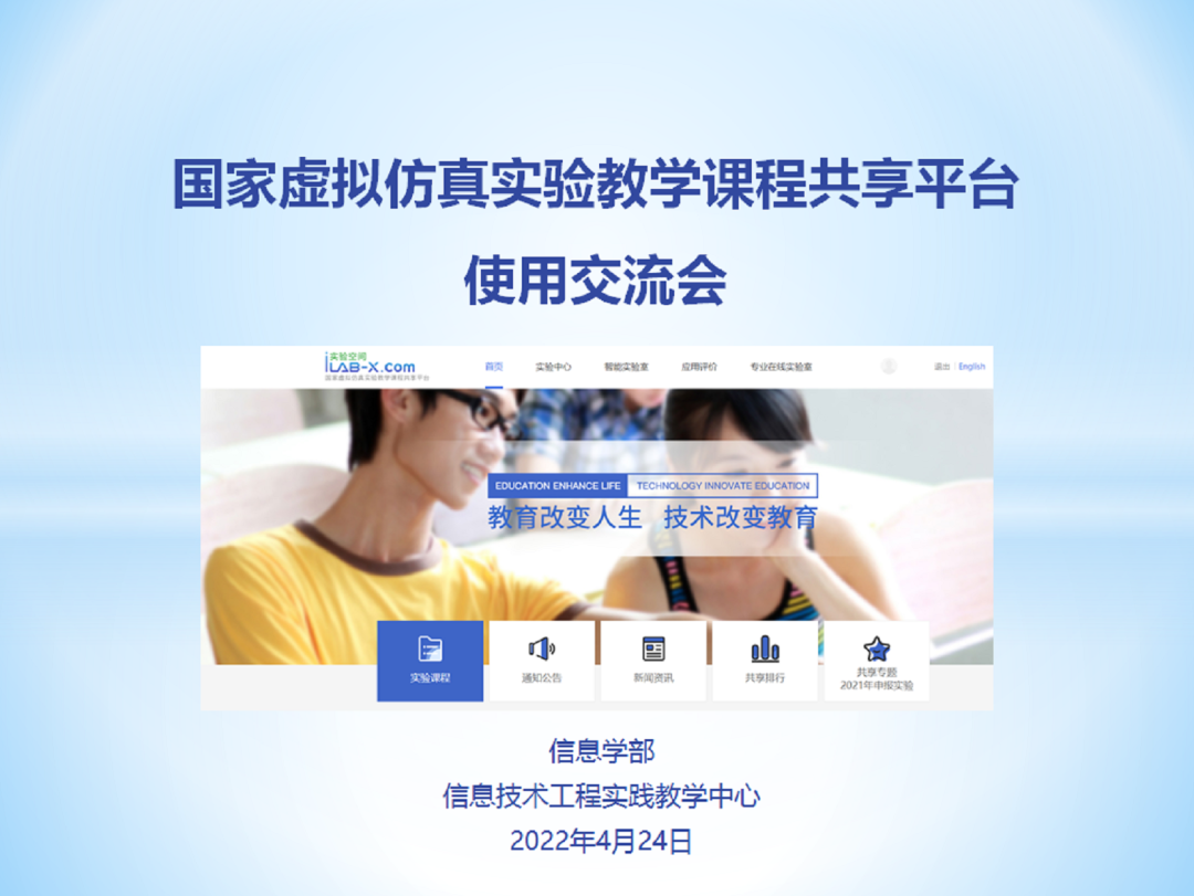 为推进虚拟仿真实验在学部实践教学中的应用,4月24日,信息学部举办国家虚拟仿真实验教学课程共享平台使用交流会,学部全体老师参加。