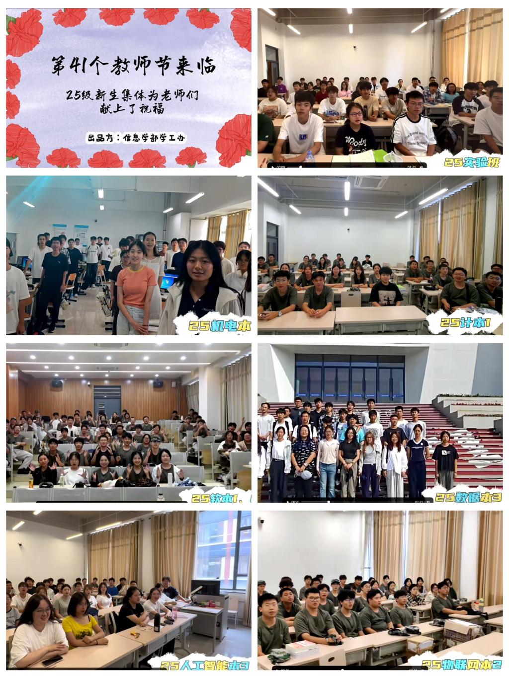 活动伊始,信息学部学生会的同学们化身 “暖心使者”,一朵鲜花,一声教师节祝福,传递着学子们最质朴的感恩之情,不仅如此,学生会还提前收集了各新生班级的祝福视频,新生们稚嫩却真挚的话语汇聚成一份份特别的“教师节礼物”,让老师们在开学季收获了满满的感动。