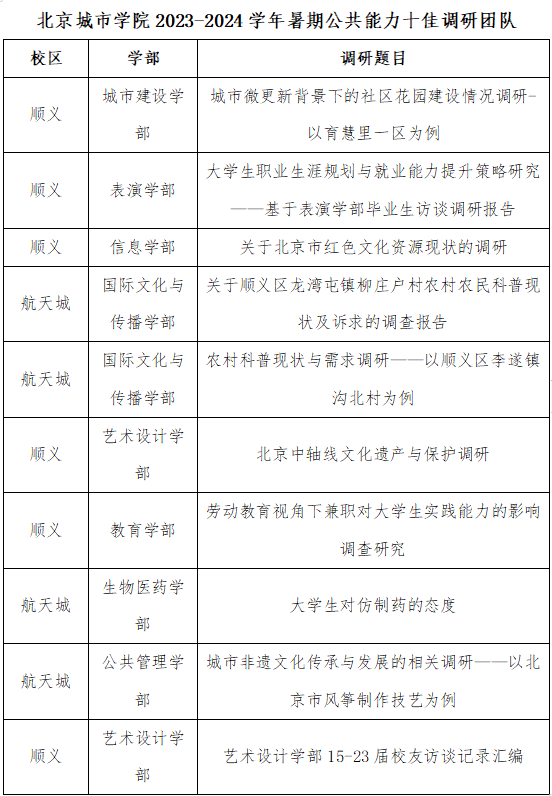 12月11日,2023-2024学年暑期公共能力调研十佳调研团队评审会暨表彰会在顺义校区综合楼1001会议室举行。学工委副书记、学管分党委副书记陈怡、教务处副处长崔惠莉、学生处副处长王毅琳、马克思主义学院副教授王清玲、心理素质教育中心主任毛晓瑞出席评审会,会议由暑期公共能力课程负责人高娜主持,共有16支团队近40名学生代表和指导老师参会。